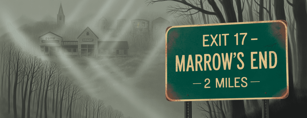 The sign wasn’t on any of their GPS maps. EXIT 17 – MARROW’S END – 2 MILES It flickered once as they passed, rusted letters glowing weakly against the dusk sky. No logos. No chain gas stations. Just the name, and the number. “Anyone else see that?” Harper asked from the passenger seat, twisting in her seat to look back. Jace grinned from behind the wheel. “Definitely haunted.”